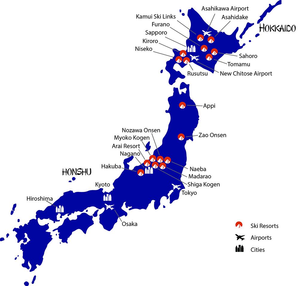 日本地图的滑雪胜地。 日本滑雪度假地图(东亚-亚)的打印。 日本滑雪度假地图(东亚-亚洲)下载。